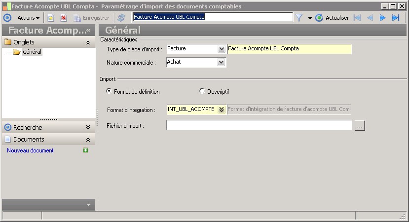 (Sage FRP 1000 Comptabilité) Menu Immobilisations > Initialisation > Import du suivi comptable > Paramétrage d'import des documents comptables