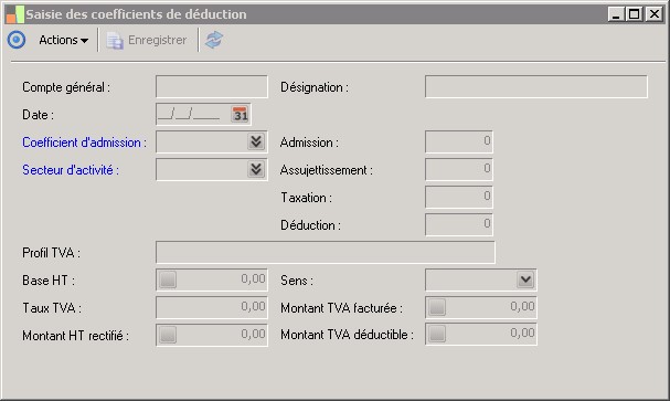 (Sage FRP 1000 Comptabilité) Menu Immobilisations > Acquisitions > Saisie des coefficients de déduction