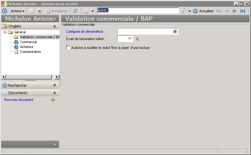 Cette zone permet d'indiquer la catégorie de demandeurs de l'opérateur. Elle est initialisée par celle du service auquel appartient l'opérateur. Elle permet, en association avec la catégorie budgétaire, de connaître la règle de validation que doit suivre la commande ou la facture saisies par l'utilisateur. |