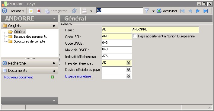 La fenêtre de saisie des pays permet d'enregistrer le code ainsi que la désignation des pays mentionnés dans les fiches adresses.