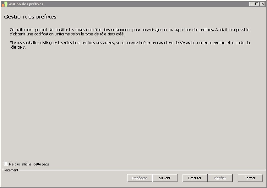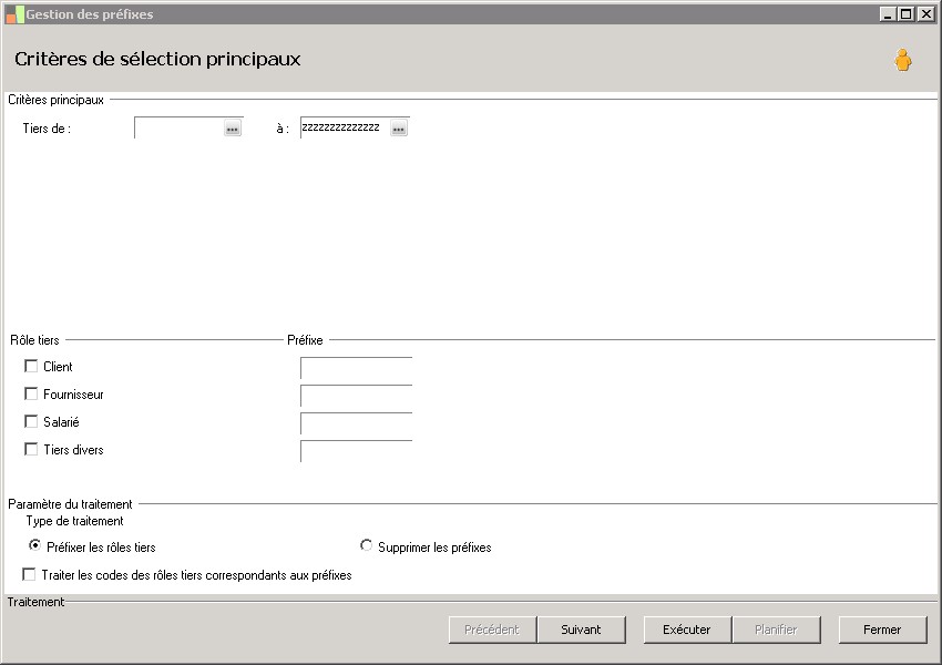 Cette zone permet d'indiquer le préfixe souhaité pour les rôles tiers de type 'Tiers Divers' à traiter.Par défaut, le préfixe est repris des paramètres de la fiche société. Sa valeur est modifiable. |
