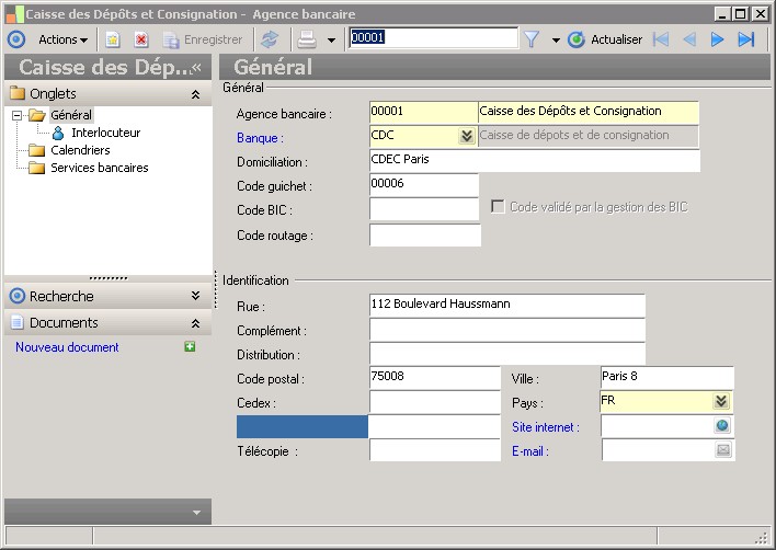 L'agence bancaire appartient à une banque. La saisie du code banque est obligatoire et identifie le code établissement. |
