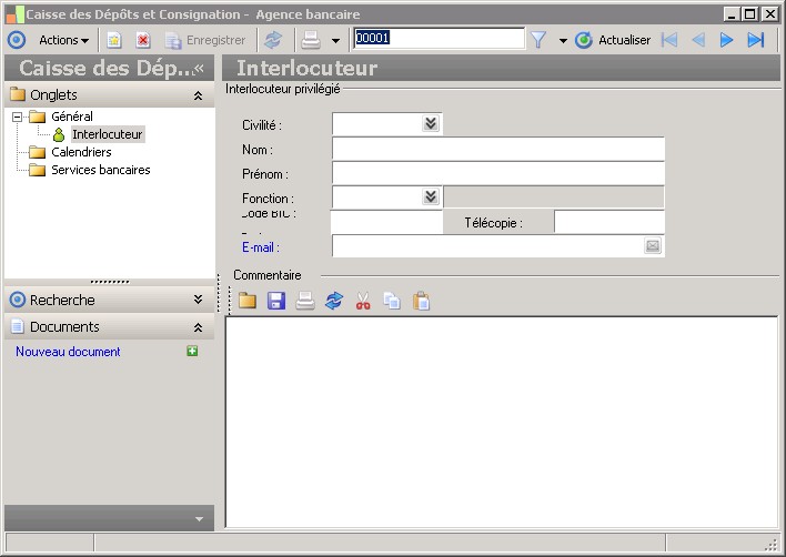permet d'accéder à la fenêtre d'enregistrement des coordonnées de votre interlocuteur privilégié au sein de cette agence. Un seul interlocuteur peut être saisi.Présentation