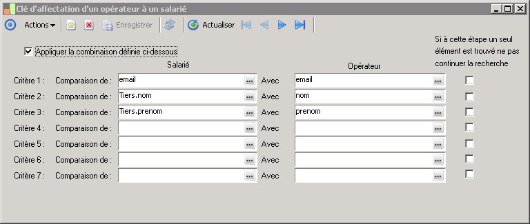 La clé permettant de rapprocher un opérateur d'un salarié est basée sur maximum 7 critèresIci le 3ème critère est défini pour le salarié il sera comparé au 3ème critère défini pour l'interlocuteur |