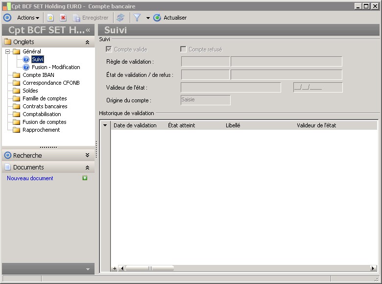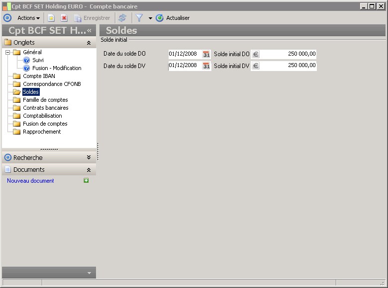 Cette zone permet de renseigner le solde initial en date d'opération du compte bancaire, soit à la création du compte bancaire, soit à la modification de la devise du compte bancaire.Cette zone est testée lors de l'importation du premier relevé bancaire afin de vérifier la cohérence des soldes. |