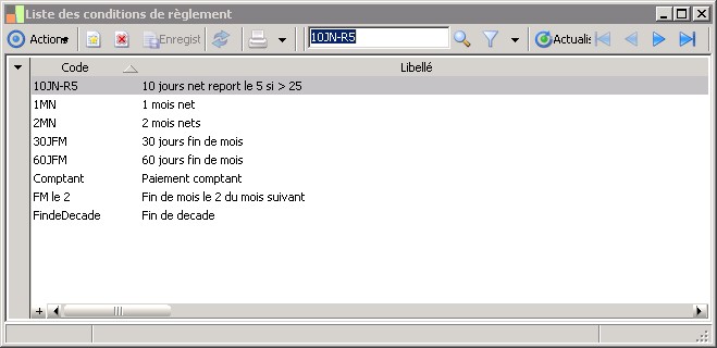 Cette fonction donne la liste et permet d'enregistrer les différentes conditions de règlement utilisées dans le programme.