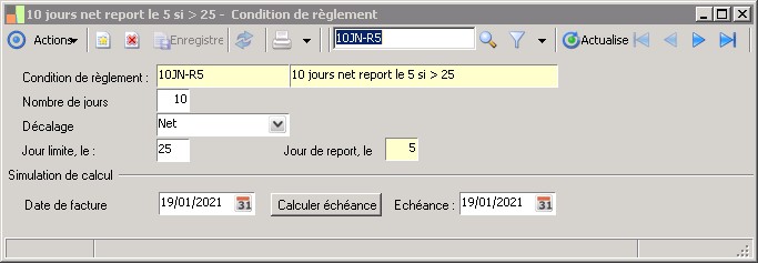 Cette fenêtre sert au paramétrage des conditions de règlement.
