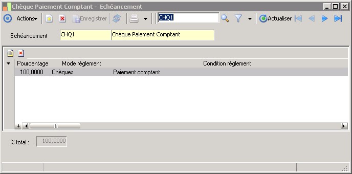 Le pourcentage permet d'éclater en une ou plusieurs échéances le règlement d'une facture.Un contrôle est effectué que le montant des pourcentages soit bien égal à 100%. |