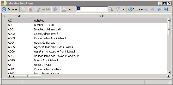 La liste des fonctions apparaît en sélectionnant la commande Paramètres / Société / Fonctions .