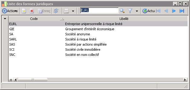 Cette fenêtre affiche la liste des formes juridiques des sociétés. Elle permet de les créer, de les consulter, de les modifier et de les supprimer si nécessaire.