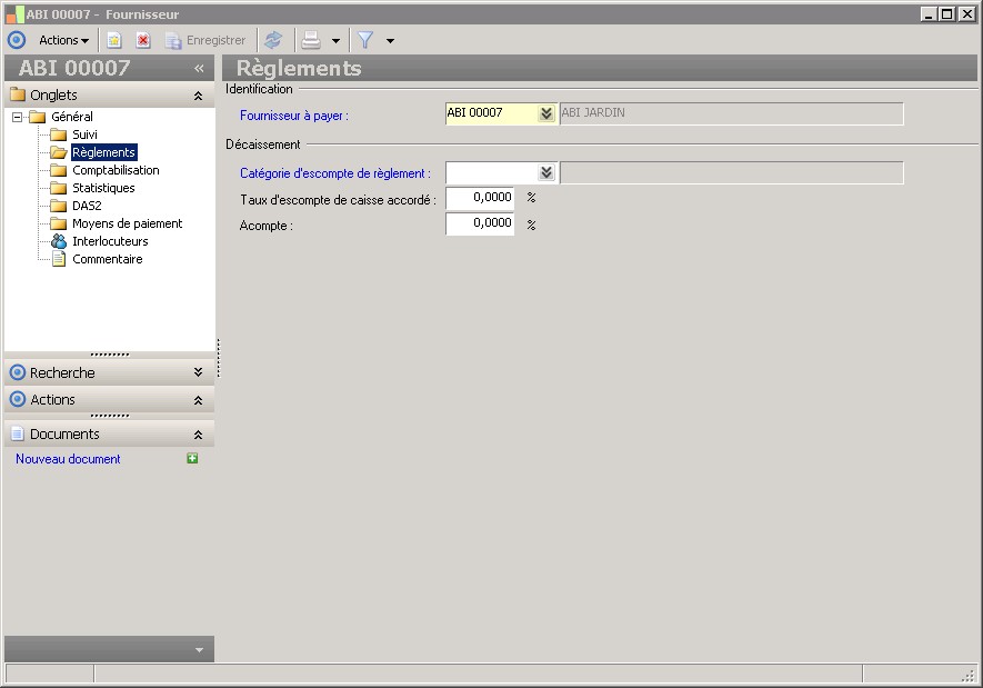 Cette information permet de définir sur le client ou fournisseur l'application d'un taux d'escompte de règlement fonction d'un nombre de jours d'avance du reglement par rapport à l'échéance. Une catégorie d'escompte de règlement regroupe plusieurs dates de début de validité définissant chacune plusieurs de taux d'escompte à raison d'un par seuil de jours d'avance (conditions d'escompte valable à partir d'une date donnée). |