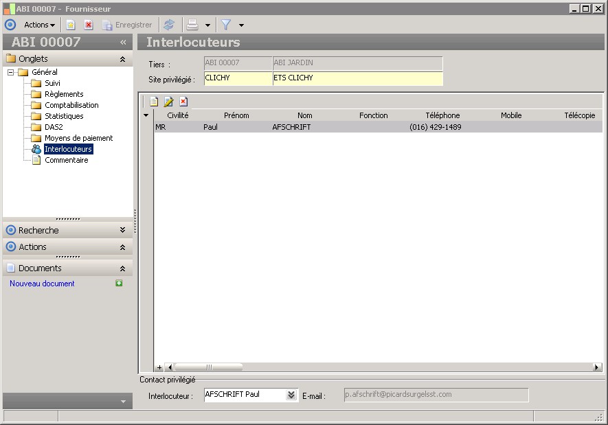 (Sage FRP 1000 Comptabilité) Menu Immobilisations > Fichiers de base > Tiers > Fournisseur