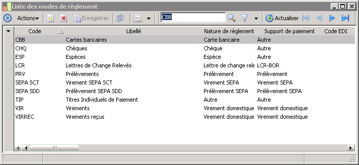 Le code permet d'identifier de manière unique un mode de règlement.La notion de mode de règlement est repris dans la détermination d'un modèle d'échéancement.Pour un Tiers, on définit un mode de règlement pour les encaissements et les décaissements; ce mode de règlement sera proposé par défaut lors de la saisie d'un règlement. |