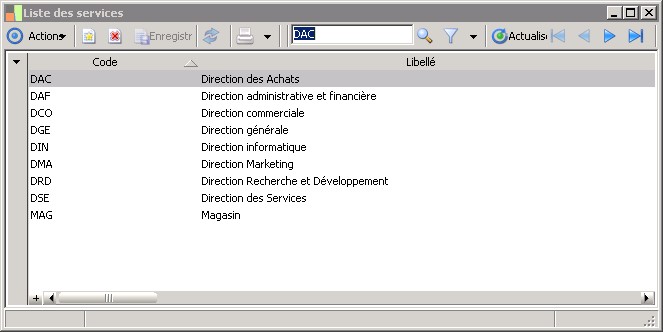 Cette fenêtre permet de saisir, de consulter ou de modifier les désignations des services commerciaux, administratifs ou autres qui peuvent exister dans vos établissements.