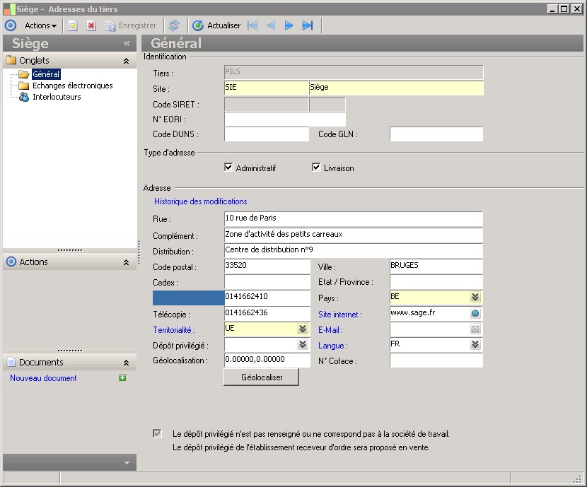 Le code permet d'identifier de manière unique un site.Au niveau de la fiche tiers, on peut gérer différents sites.Quand on attribue un rôle à un tiers, on indique le site privilégié du rôle tiers.