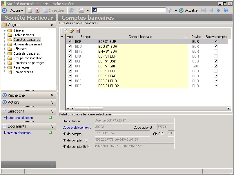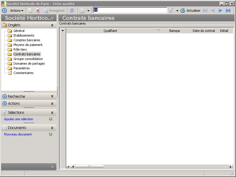 Cette classe regroupe les contrats bancaires établis avec les différentes banques des sociétés. |