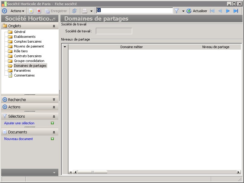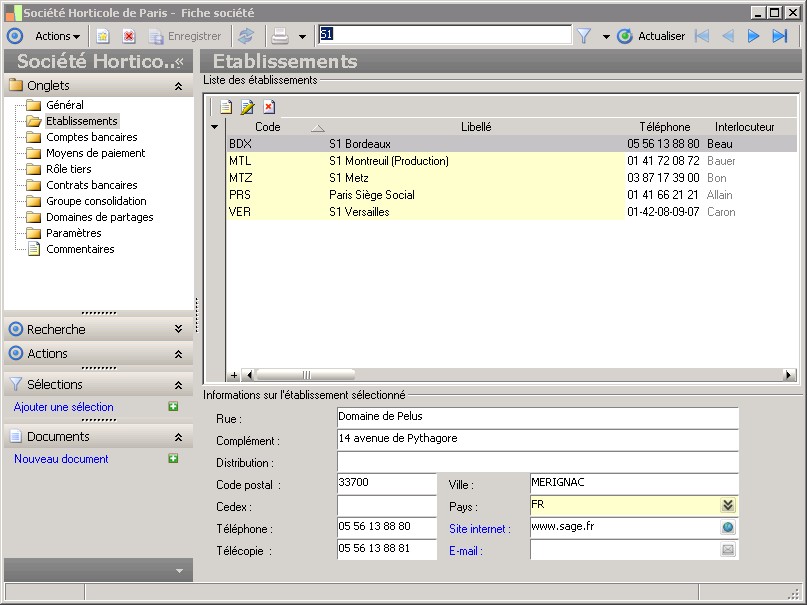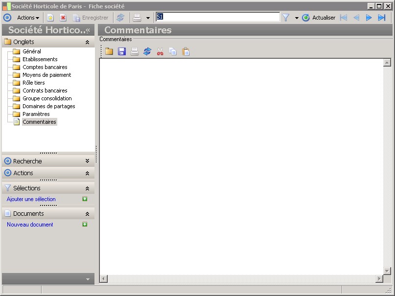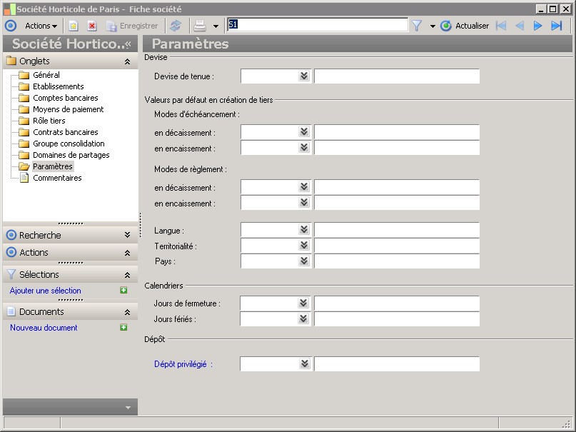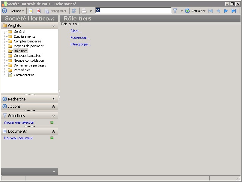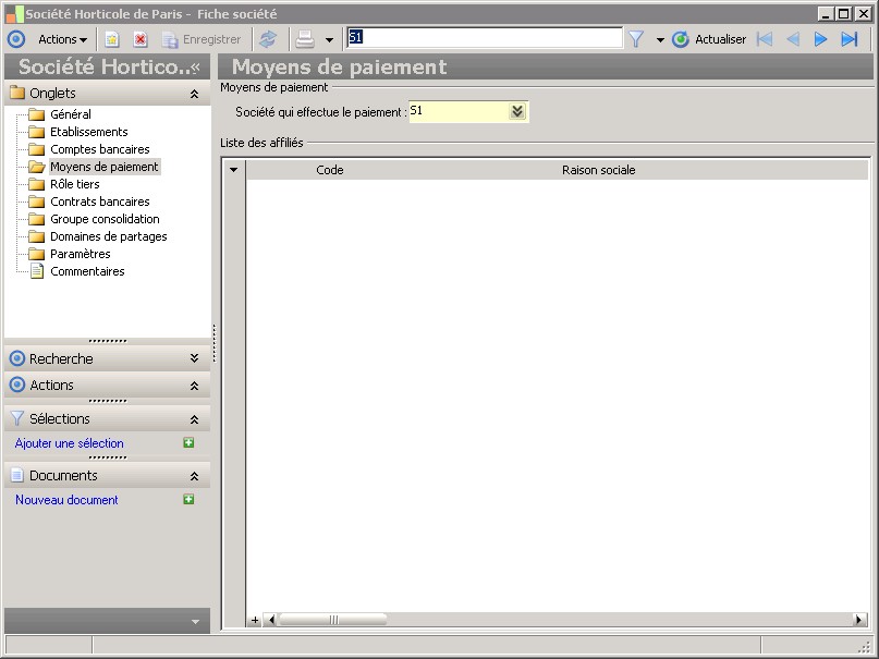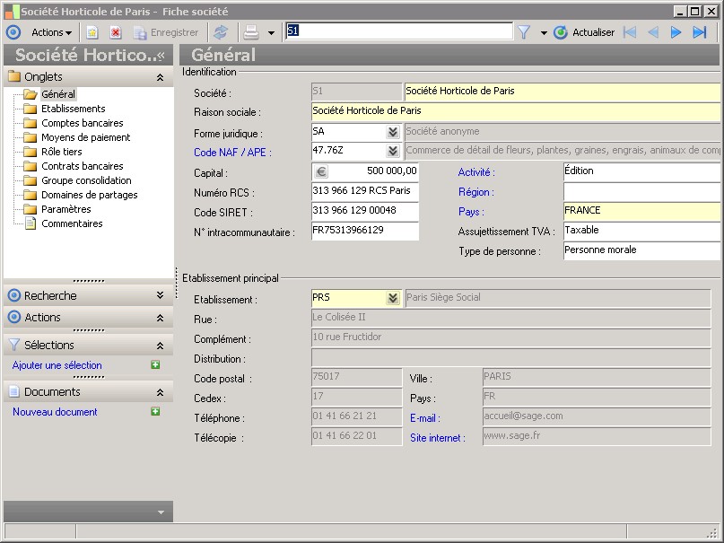 Dans la fenêtre Fiche société, la présence des fonctions décrites dans ce contexte dépend des applications installées. |