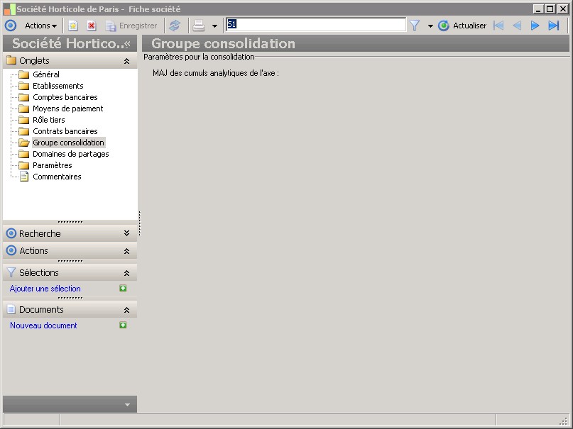 Pour chacun des tiers sociétés associé à une base de données, il est possible d'indiquer un axe analytique. Lors du processus d'alimentation des cumuls analytiques, les cumuls analytiques de l'axe indiqué dans le tiers société seront repris dans l'application groupe. |
