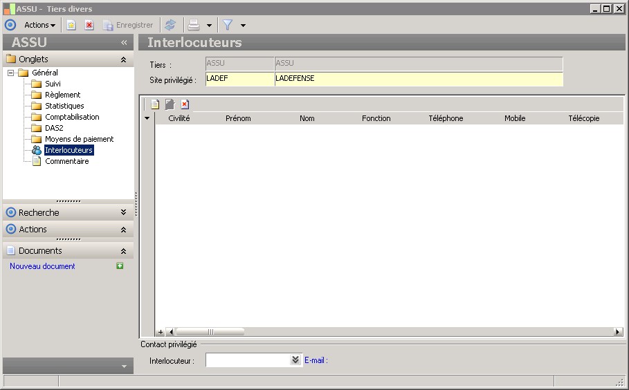 Le code permet d'identifier de manière unique un site.Au niveau de la fiche tiers, on peut gérer différents sites.Quand on attribue un rôle à un tiers, on indique le site privilégié du rôle tiers. |