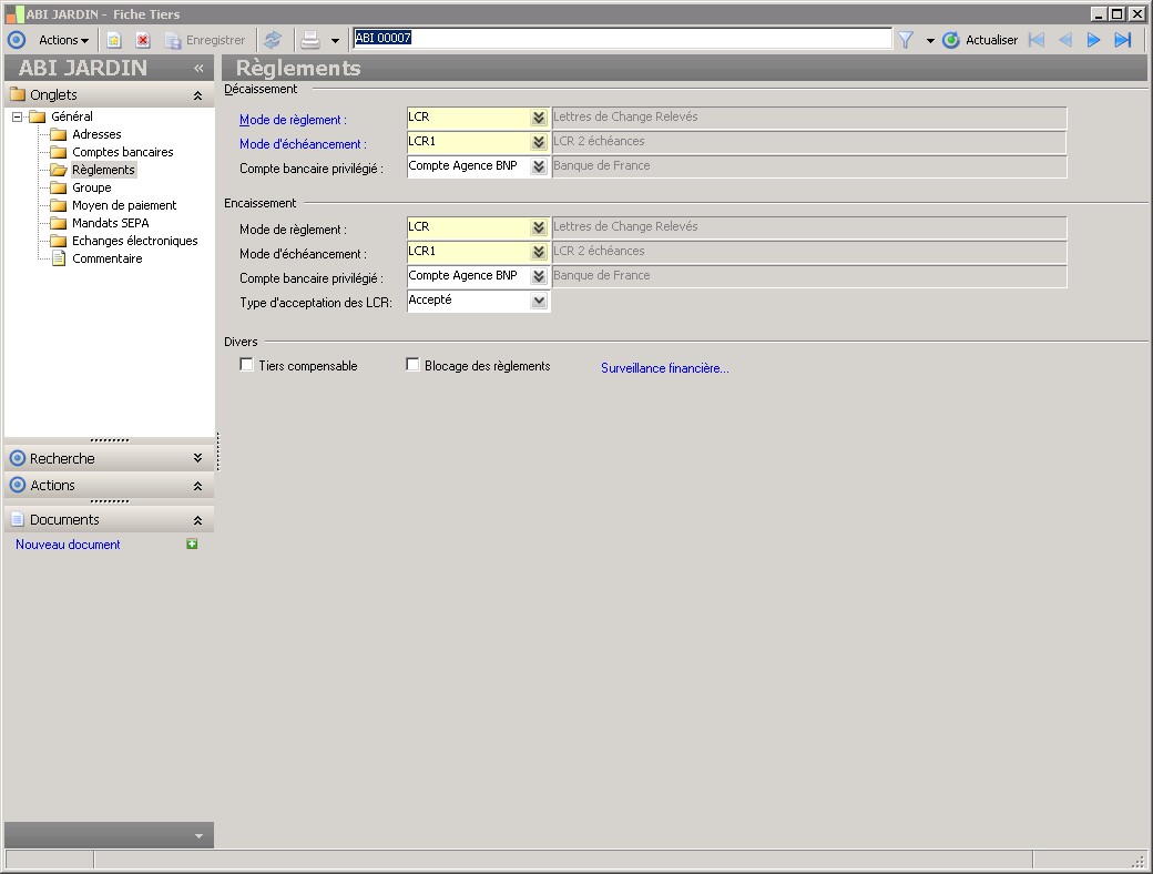 Cet attribut permet d'interdire les règlements sur un tiers. Ainsi, il sera impossible de créer un règlement sur ce tiers que ce soit par la fonction des bordereaux de règlement ou par celle de la gestion des règlements automatiques. |
