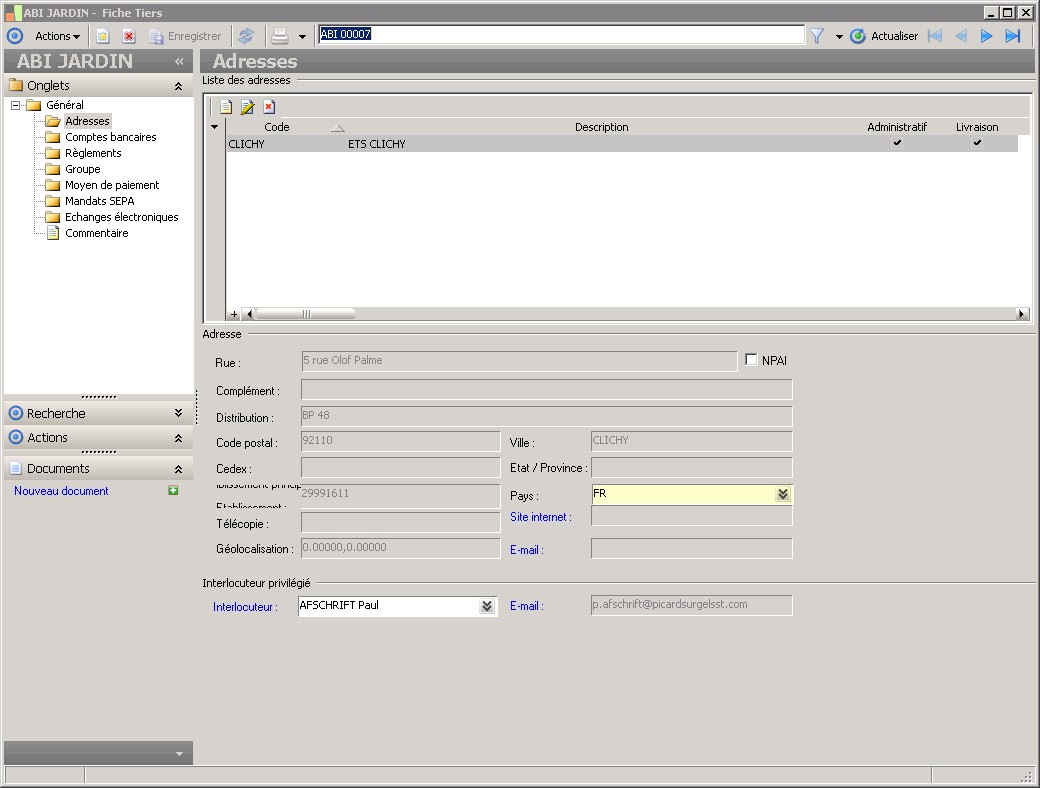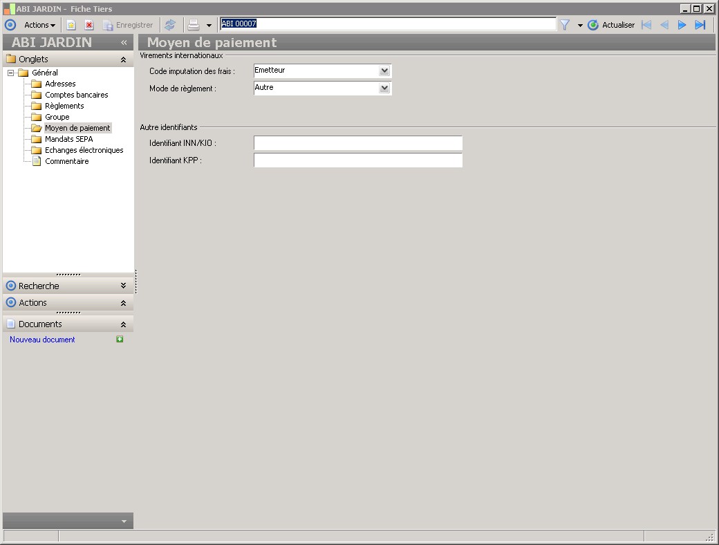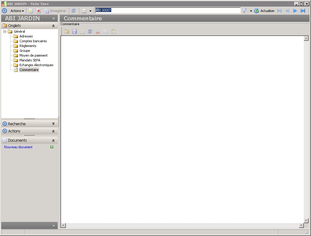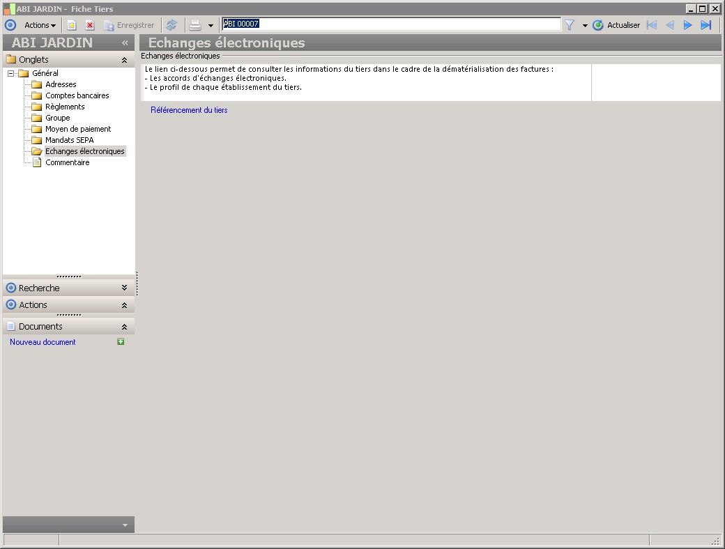 Dans la fenêtre Fiche Tiers, la présence des fonctions décrites dans ce contexte dépend des applications installées. |