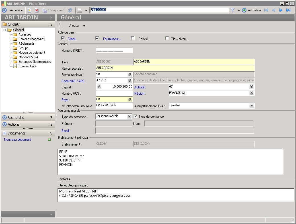 Un établissement principal est obligatoirement rattaché à un tiers. |