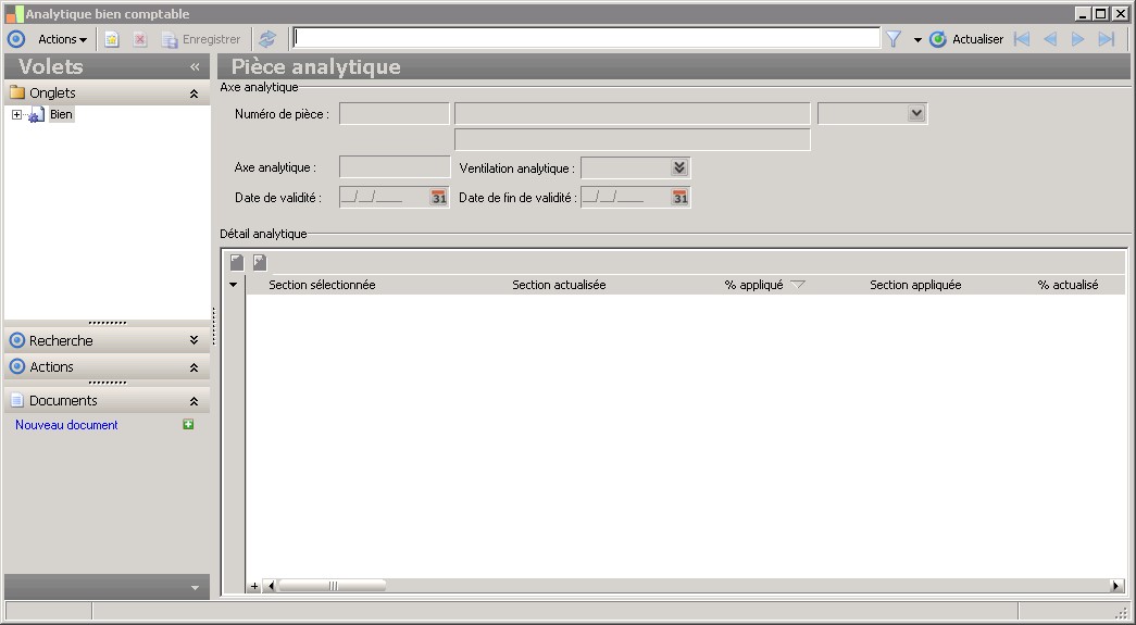 Tant que la pièce analytique n'est pas validée, la section analytique peut être actualisée :- par toute modification intervenant sur une information du bien, qui participe à la constitution de la section analytique (quand l'axe analytique lié est en constitution automatique),- ou par une modification de la section analytique saisie (quand l'axe analytique lié n'est pas en constitution automatique). |
