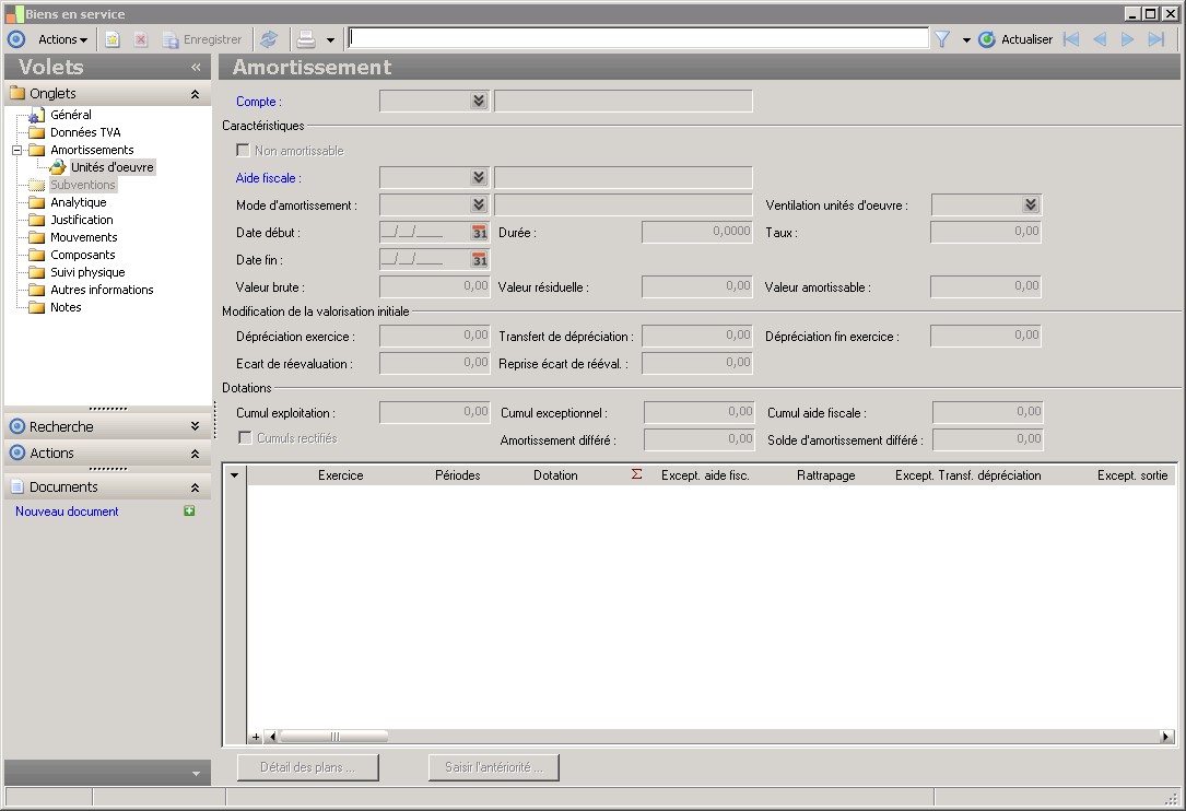 Cette zone permet de renseigner la date de mise en service de l'immobilisation. Elle sera automatiquement renseignée si le bien est issu d'un mouvement de mise en service d'en cours. Elle correspond également à la date de début du plan de ventilation en unités d'oeuvre. Cette information n'est plus modifiable lorsque le bien est valide. |