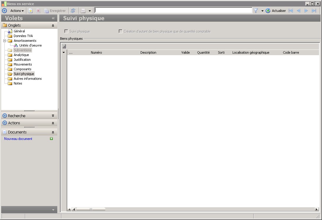 Cette case à cocher permet d'indiquer si le bien doit être suivi physiquement ou non. Dans l'affirmative, le bien comptable pourra être utilisé pour créer ou être associé à un ou plusieurs biens physiques lui correspondant. |