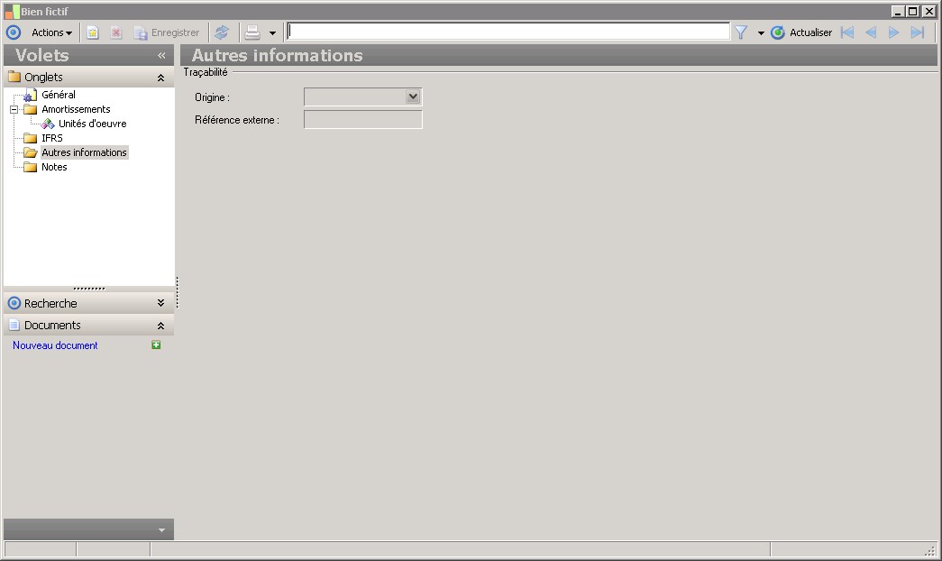 (Sage FRP 1000 Comptabilité) Menu Immobilisations > Suivi comptable > Biens > Bien fictif