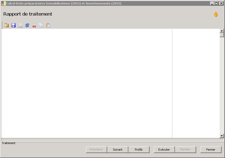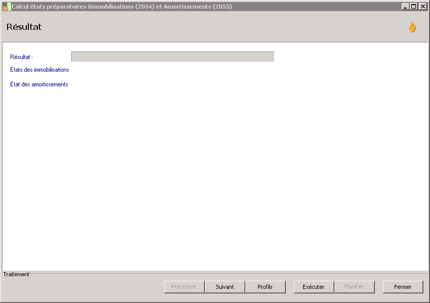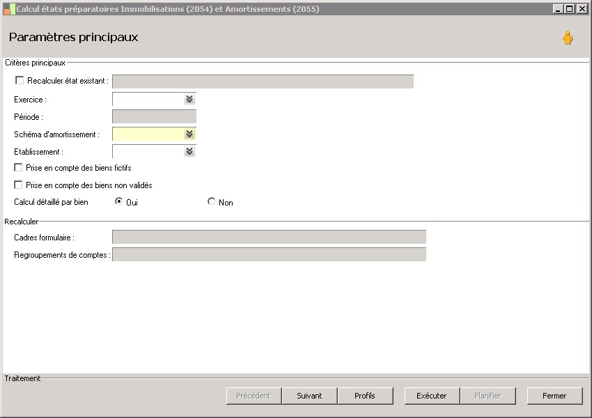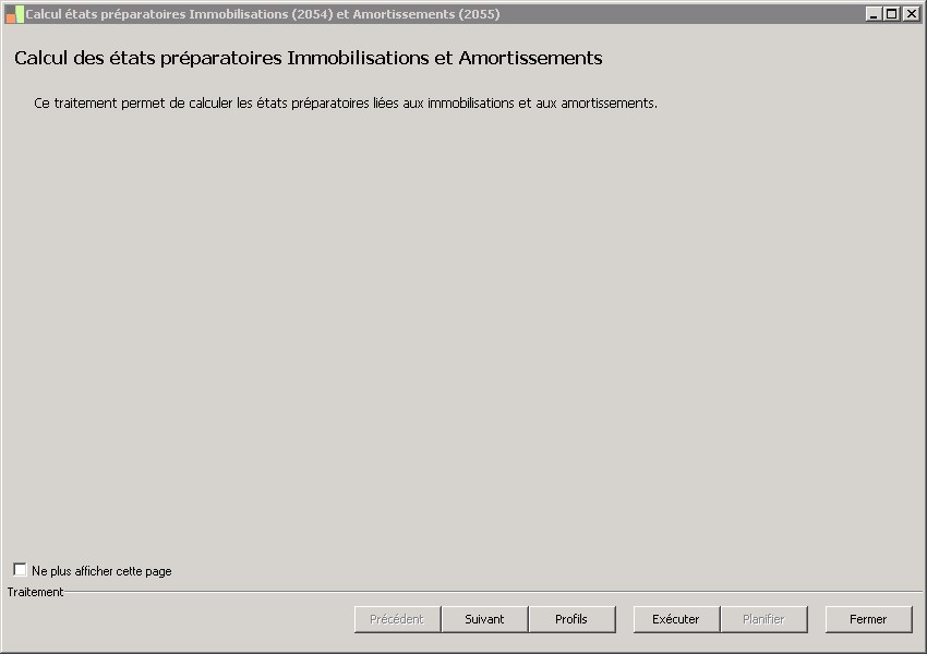 (Sage FRP 1000 Comptabilité) Menu Immobilisations > Arrêtés comptables > Etats 2054 2055 > Calcul états préparatoires Immobilisations (2054) et Amortissements (2055)