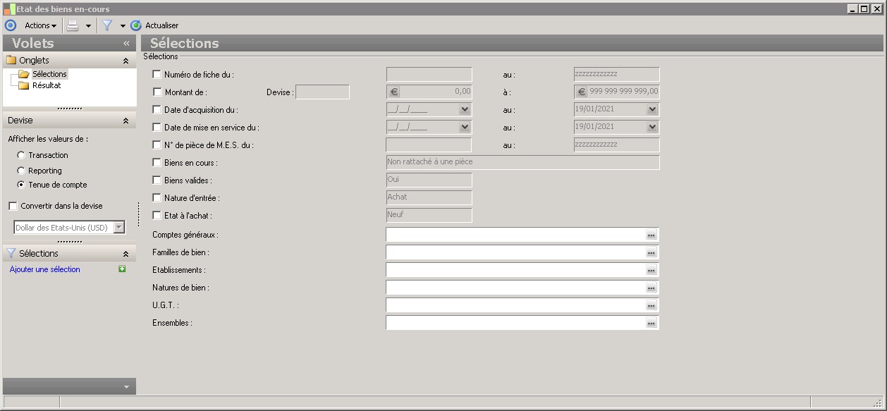 Ce paramètre permet d'effectuer un choix sur l'état du bien en-cours, entre les valeurs suivantes :Non rattaché à une pièce : Le bien en-cours n'est pas rattaché à une pièce de mise en service.Attaché à une pièce : Le bien en-cours est rattaché à une pièce de mise en service qui n'est pas valide.Mis en service : La pièce de mise en service est valide, le bien en service est créé. |
