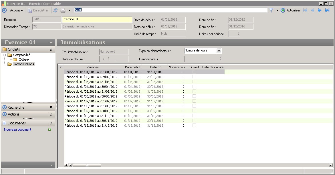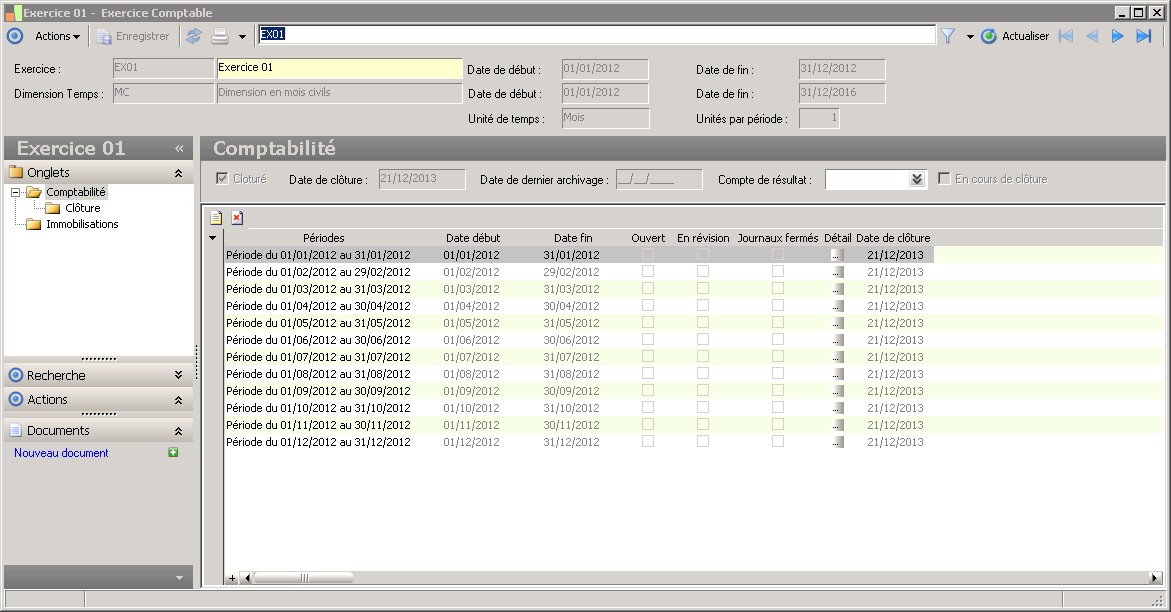 Le code identifie l'exercice de façon unique.Les exercices utilisent les périodes de la dimension temps préalablement créée.On peut avoir autant d'exercices que nécessaire, dans la limite de la dimension temps. |