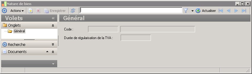 (Sage FRP 1000 Comptabilité) Menu Immobilisations > Fichiers de base > Immobilisations > Nature de bien