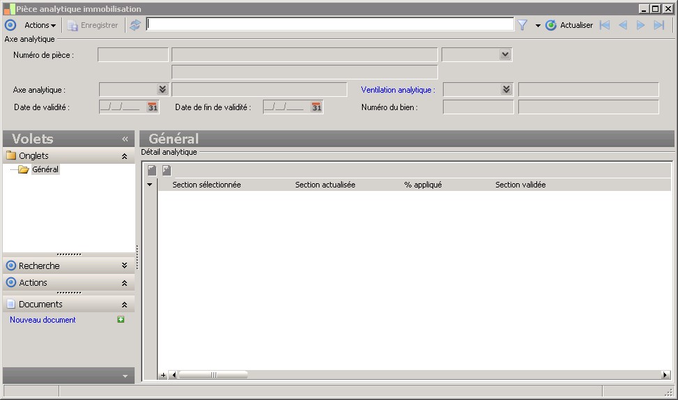 Tant que la pièce analytique n'est pas validée, la section analytique peut être actualisée :- par toute modification intervenant sur une information du bien, qui participe à la constitution de la section analytique (quand l'axe analytique lié est en constitution automatique),- ou par une modification de la section analytique saisie (quand l'axe analytique lié n'est pas en constitution automatique). |
