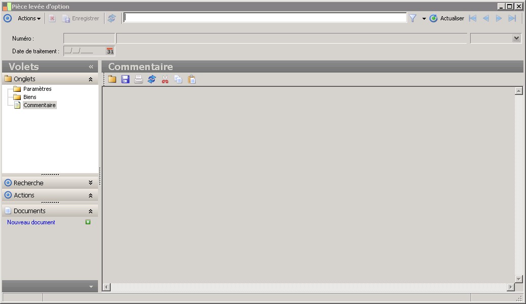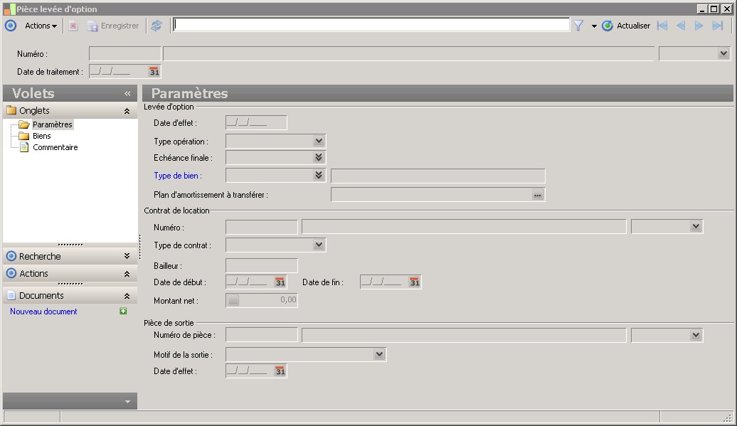 (Sage FRP 1000 Comptabilité) Menu Immobilisations > Contrats > Pièce levée d'option