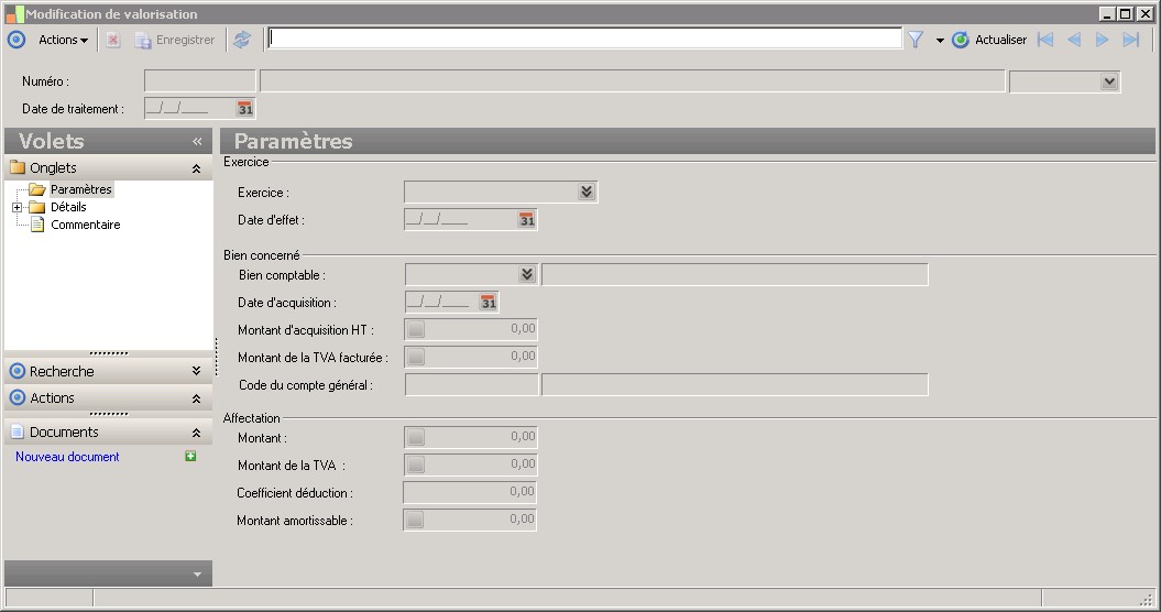 (Sage FRP 1000 Comptabilité) Menu Immobilisations > Suivi comptable > Biens > Modification de valorisation