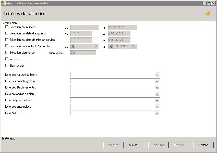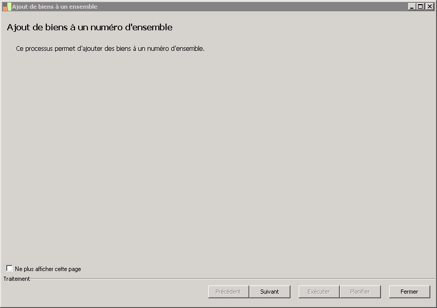(Sage FRP 1000 Comptabilité) Menu Immobilisations > Fichiers de base > Immobilisations > Ajout de biens à un ensemble
