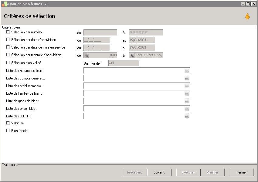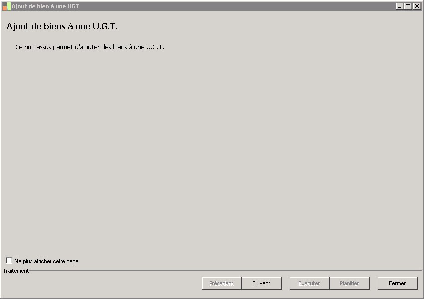 (Sage FRP 1000 Comptabilité) Menu Immobilisations > Fichiers de base > Immobilisations > Ajout de bien à une UGT