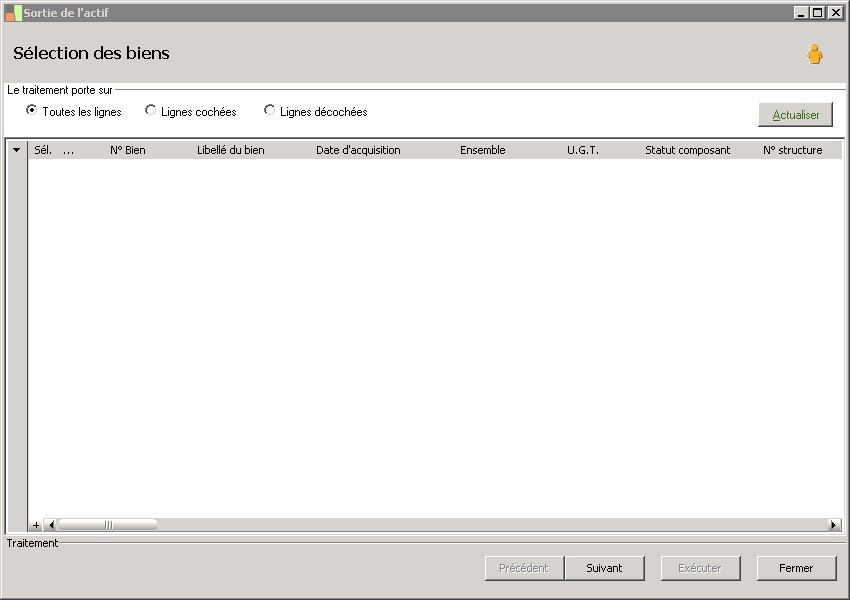 Cette zone permet d'indiquer comment sera réparti le prix de cession sur l'ensemble des biens composant la pièce de sortie. Cette répartion peut se faire d'après:le monant d'acquisitionla valeur brute du schémala valeur nette de sortie du schéma |