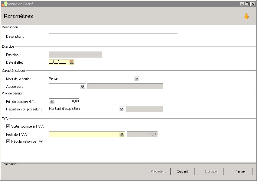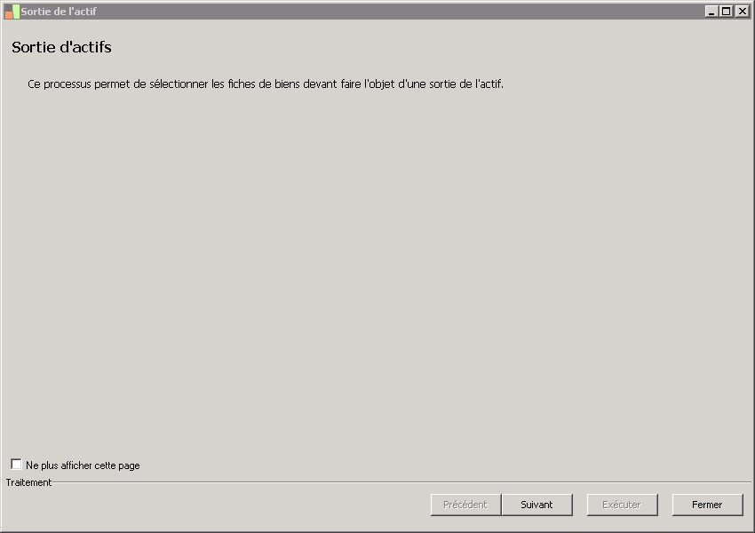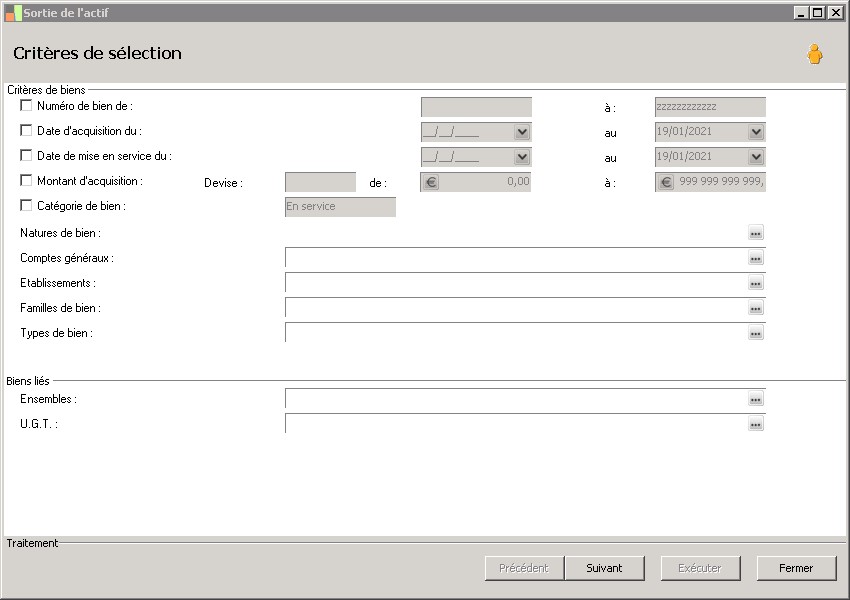 (Sage FRP 1000 Comptabilité) Menu Immobilisations > Suivi comptable > Sortie > Sortie de l'actif