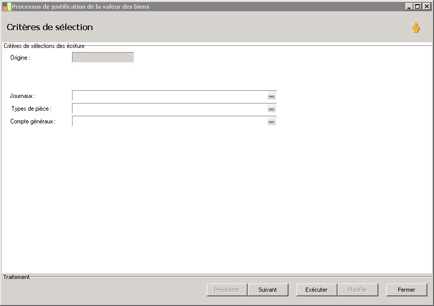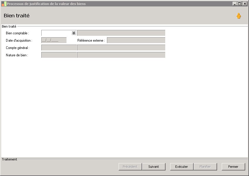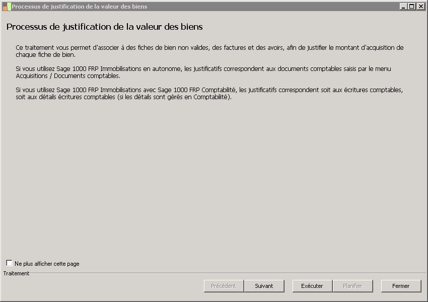(Sage FRP 1000 Comptabilité) Menu Immobilisations > Suivi comptable > Biens > Processus de justification de la valeur des biens