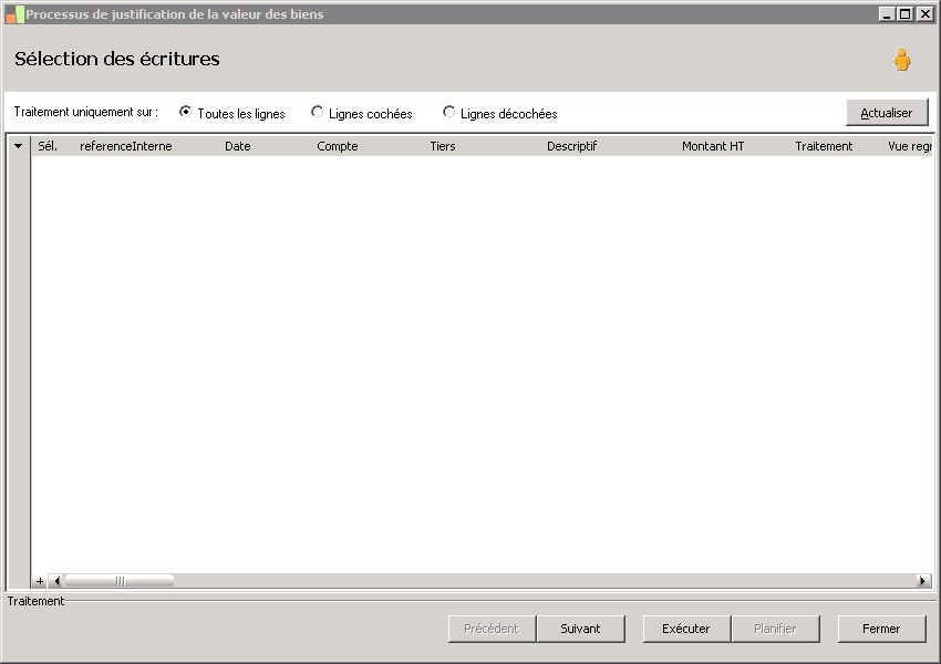 Cette zone permet de sélectionner le traitement à affecter à la ligne de facture.Aucun : la ligne ne sera pas traitéeCréation : la ligne créera un bienModification : la ligne modifiera un bien |