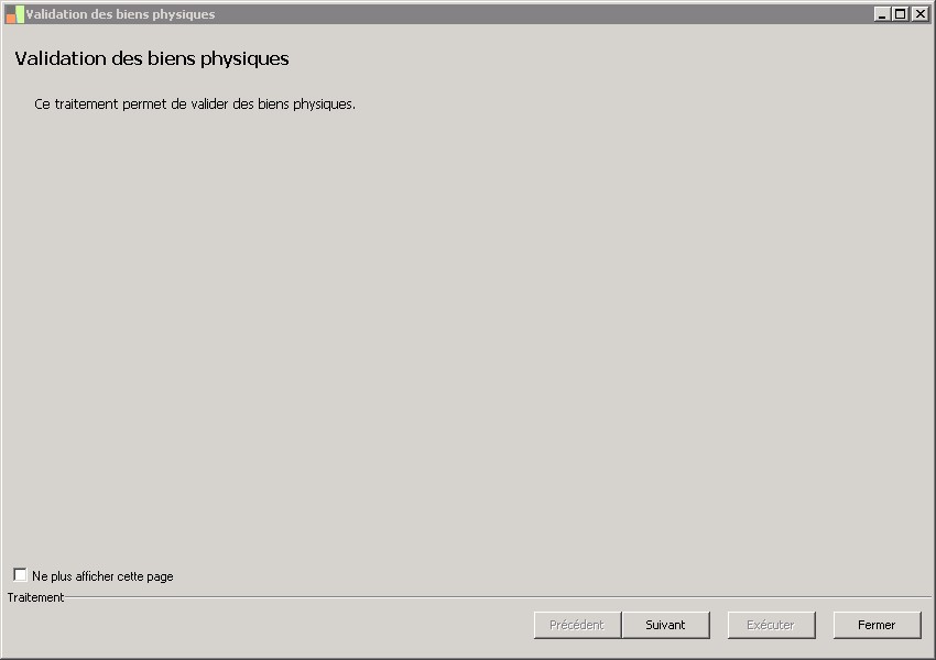 (Sage FRP 1000 Comptabilité) Menu Immobilisations > Suivi physique > Validation > Validation des biens physiques