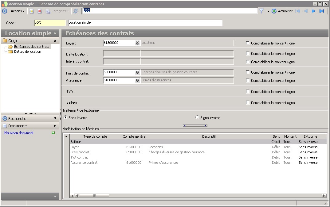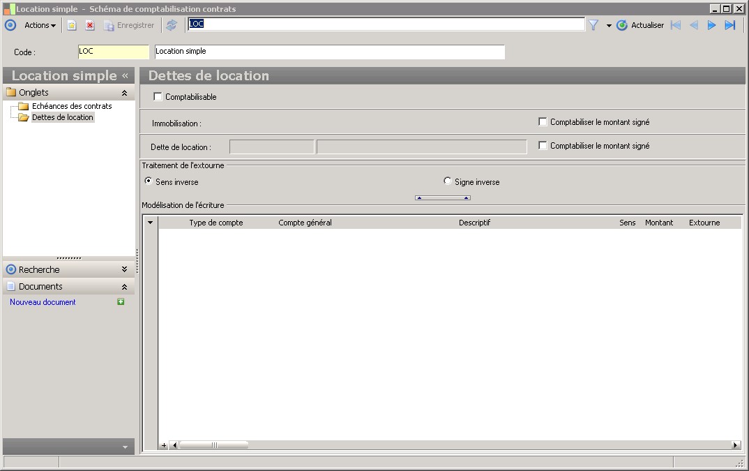 Attention, vous devez impérativement renseigner tous les comptes d'un schéma de comptabilisation, y compris ceux qui n'apparaissent pas comme étant obligatoires. Ceci est nécessaire pour le traitement de comptabilisation des échéances et dettes de location. |