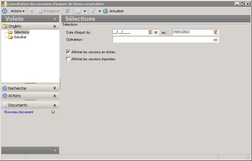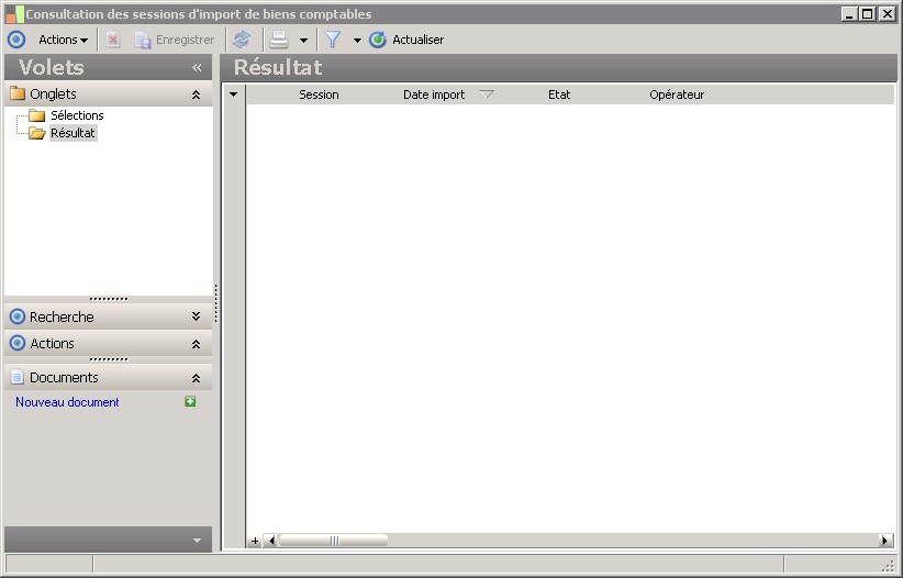 (Sage FRP 1000 Comptabilité) Menu Immobilisations > Initialisation > Import du suivi comptable > Consultation des sessions d'import de biens comptables
