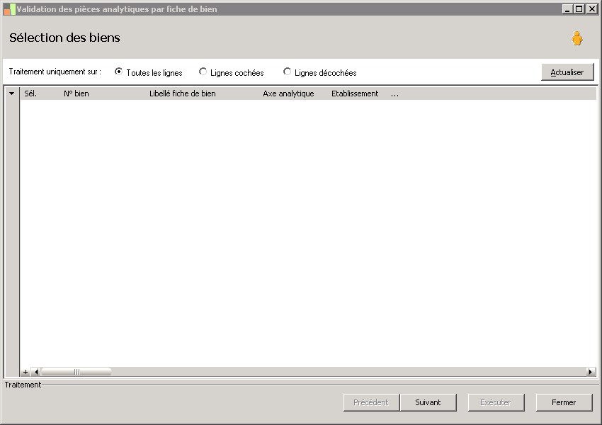 (Sage FRP 1000 Comptabilité) Menu Immobilisations > Suivi comptable > Analytique > Validation des pièces analytiques par fiche de bien