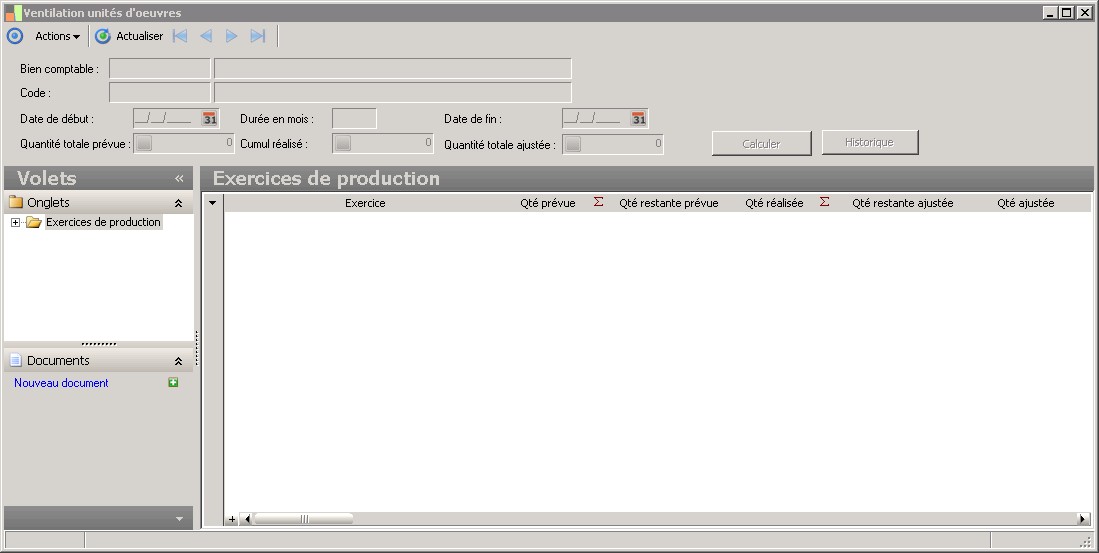 Si le plan de ventilation débute sur un exercice antérieur à l'exercice en cours, les exercices antérieurs seront représentés sur une seule et même ligne. Dans ce cas il faut saisir un cumul d'unités d'?uvre prévues et réalisés global à ces exercices antérieurs.