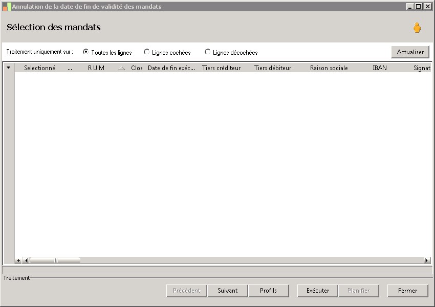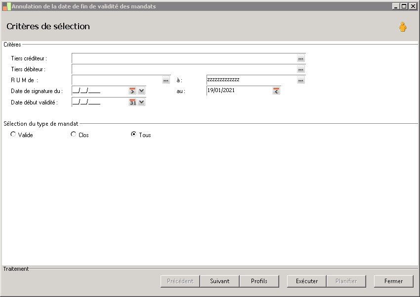 Critère de sélection sur référence mandat pour la suppression des dates de fin d'exécution. |