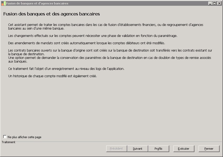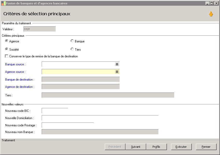 (Sage FRP 1000 Comptabilité) Menu Banque Paiement > Paramètres > Banques > Fusion de banques et d'agences bancaires